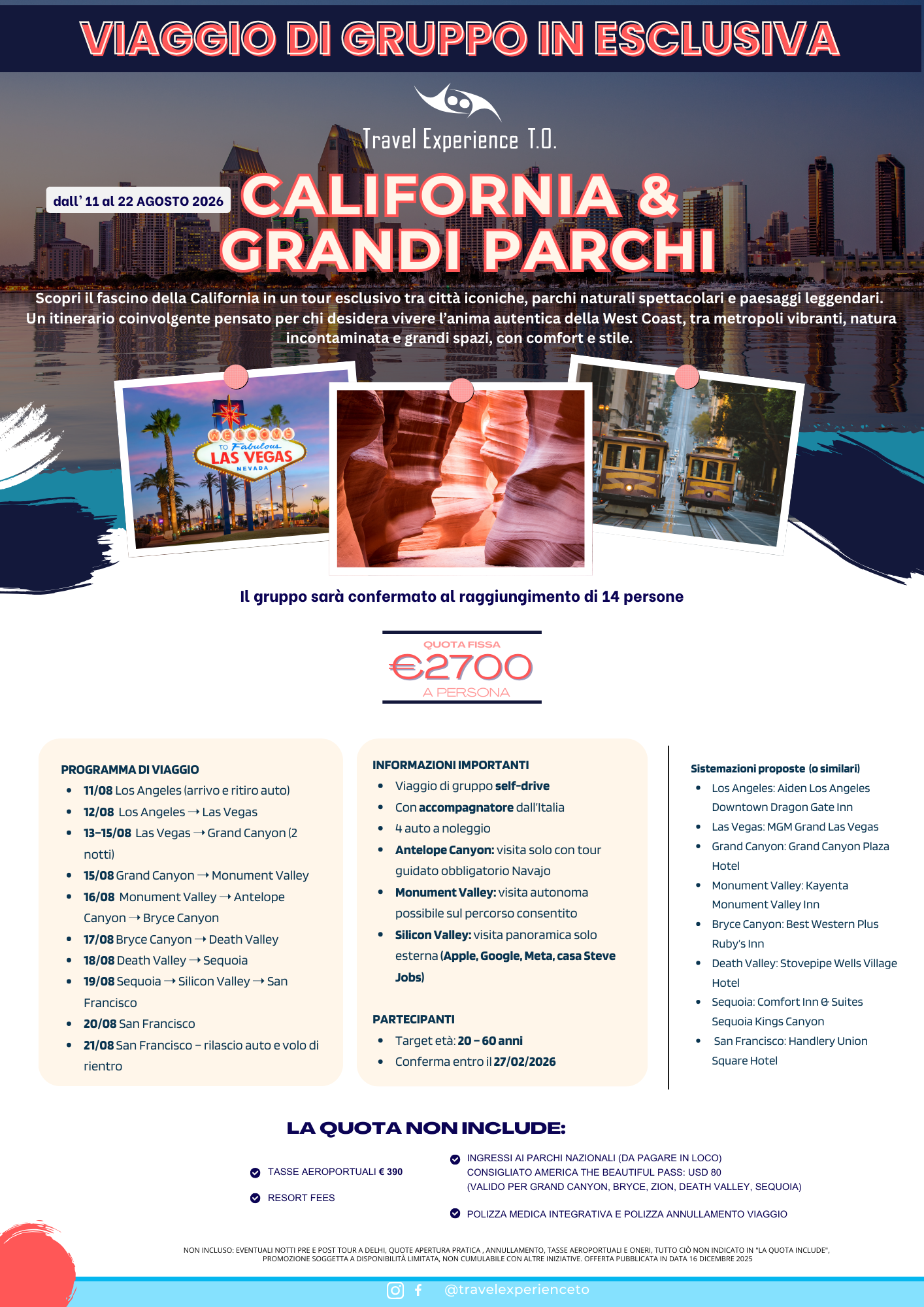 Un marchio altamente specializzato nella creazione di viaggi su misura: Flessibilità, Dialogo, Tecnologia che si traducono in efficienza, efficacia e professionalità. Una vastissima programmazione che comprende un’ampia e completa scelta di strutture ricettive su tutte le destinazioni proposte; trasferimenti, escursioni, noleggi auto, moto e camper, itinerari fly and drive, tour guidati con accompagnatore in lingua italiana esclusiva e multilingue, soluzioni ranch, escursioni e soft adventures.